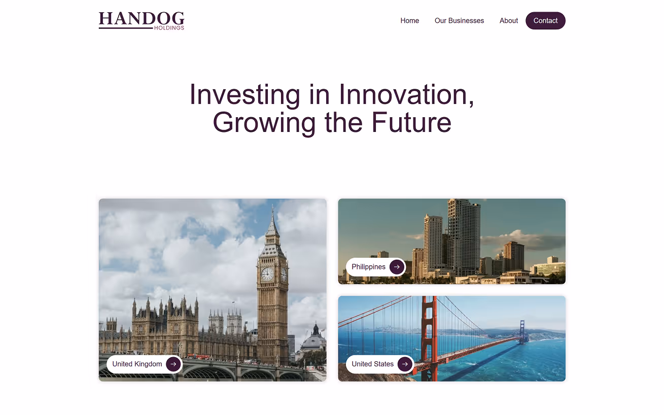 Having been a successful investment company behind closed doors for years, Handog Holdings came to us needing a brand that reflected innovation, experience, and integrity, and positioned them as a leading global investment firm. With plans to expand and attract both new investors and businesses seeking investment, the challenge was to design a website and brand identity that conveyed corporate success while maintaining an approachable, open feel. As the number of companies under the holding group continued to grow, the site also needed to be scalable, easy to navigate, and simple to manage. Since this was Handog Holdings’ first public launch, it was essential to lay strong branding foundations for consistency across all platforms.